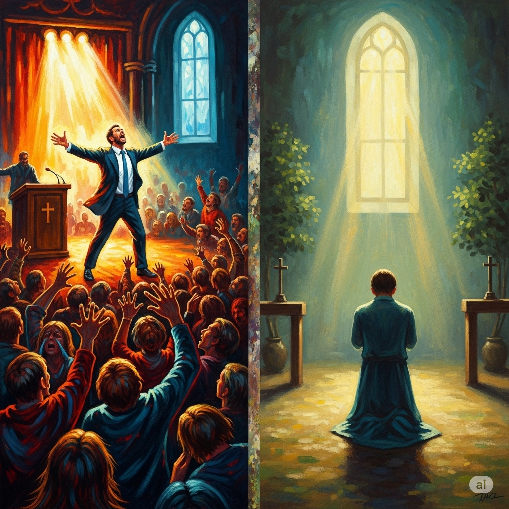 As pessoas que buscam a Deus nesse tipo de ambiente são levadas a crer que a fé é uma atuação, uma demonstração de energia e fervor que, se bem executada, força Deus a agir. Contudo, essa visão distorcida do evangelho ignora a soberania divina e a importância da fé silenciosa e perseverante, que se sustenta não em sentimentos efêmeros, mas em uma profunda e íntima relação com Cristo.